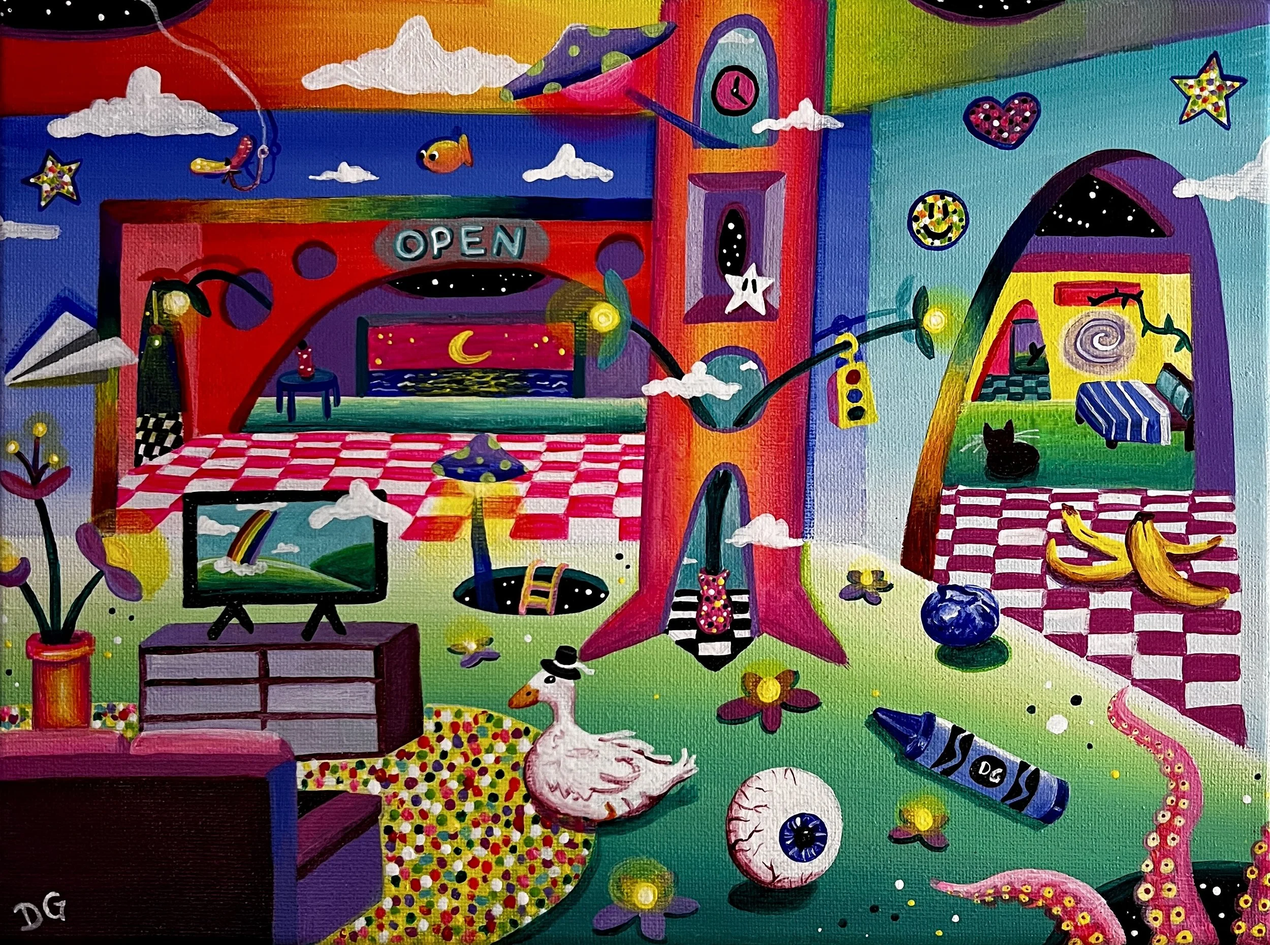 Welcome to my Wonderland! A unique universe of art that is more than just a painting, it’s an EXPERIENCE! My art is an escape from reality, a place to travel to, throughout, & within itself. You must be mindful to really see what is going on.